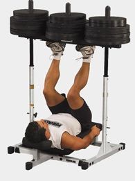 Простейший станок для жима ногами - это диск со штанги, висящий над Вами. Лежа под ним надо выполнять жим ногами. Вдох делается при движении вниз. Выдох - при движении вверх.